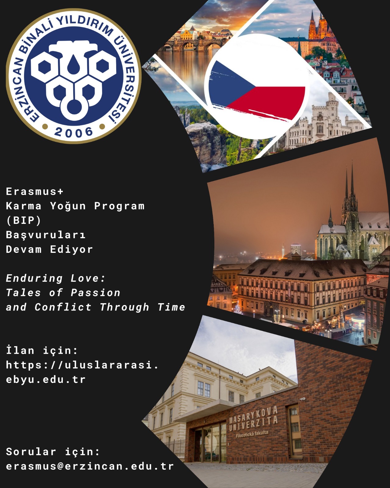 Erzincan Binali Yıldırım Üniversitesi Uluslararası İlişkiler Koordinatörlüğü Erasmus+ KA131 (AB Üye Ülkeleri ve Programla İlişkili Üçüncü Ülkeler) Kısa Dönem Öğrenci Öğrenim ve Personel Eğitim Alma Hareketliliği kapsamında “Enduring Love: Tales of Passion and Conflict Through Time” isimli Karma Yoğun Program (BIP) 6-10 Nisan 2026 tarihleri arasında düzenlenecektir.