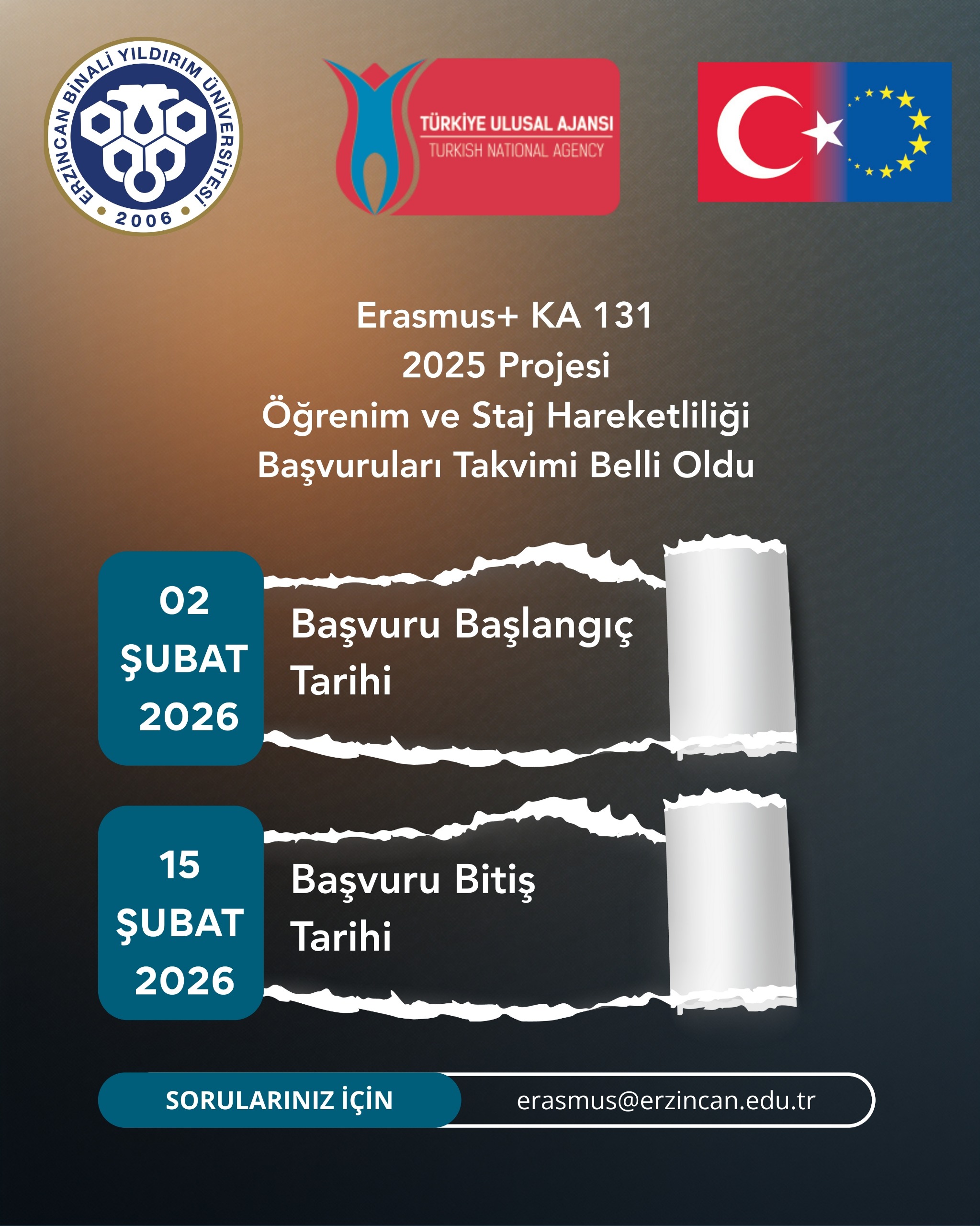 Üniversitemizde Erasmus Programı Öğrenci Hareketliliği Başvuruları, T.C. Dışişleri Bakanlığı Avrupa Birliği Başkanlığı Avrupa Birliği Eğitim ve Gençlik Programları Merkezi Başkanlığı Türkiye Ulusal Ajansı TURNAPortal sistemi aracılığıyla E-Devlet şifresi ile https://turnaportal.ua.gov.tr adresi üzerinden 02.02.2026 – 15.02.2026 tarihleri arasında alınacaktır.